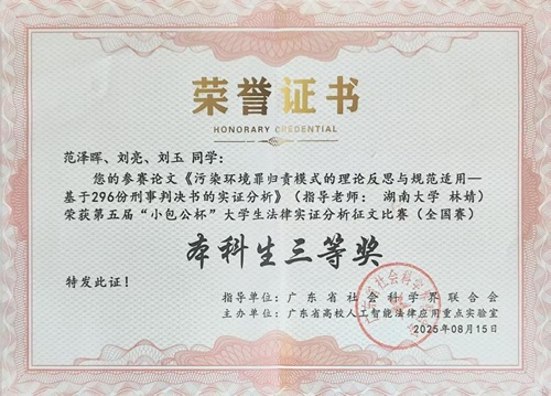 林婧老师的指导下,组成跨年级合作团队,聚焦环境刑事司法领域,以《污染环境罪规则模式的理论反思与规范适用——基于296份刑事判决书的实证分析》为选题,梳理了司法实践中的争议问题与裁判逻辑,凭借数据分析与规范研究获得本科生组三等奖。