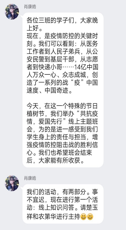 主题班会开始之前,班长肖康皓向同学们简单介绍此次班会的内容和流程,倡导同学们自由积极地发表感想。在线上问答环节中,针对疫情基本特点以及防控知识等相关问题,同学们进行阐述和讨论。通过科普问答的形式排查防疫知识漏洞,同学们对防控知识有了更准确的了解。