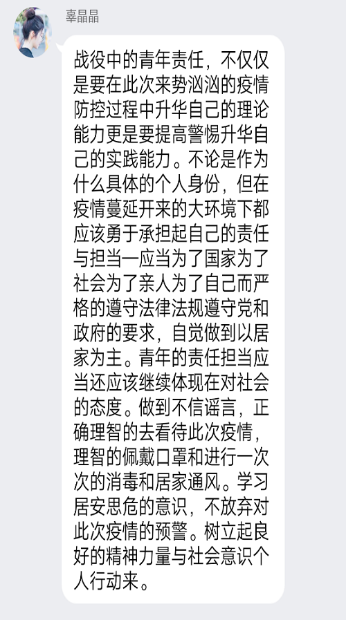 为普及疫情防控知识,增强抗疫必胜信心,引导同学们更加清晰地认识中国特色社会主义制度优势,强化疫情期间同学们的爱国主义精神,在班委的组织下,法学1803班开展线上主题班会。此次班会由疫情防控线上知识问答和理解习近平总书记的重要指示精神两个环节组成,法学1803班全体同学积极参加。
