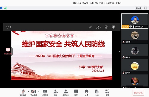 此次班会由文娱委员张海洋主持,法学1902班全体同学参加此次会议。会议伊始,张海洋同学通过屏幕共享组织全班同学们在“平安湖大在线”微信公众号学习国家安全教育系列微课,并结合时事和班会主题,选择“传染病来袭,每个人都有责任和义务”及“国家安全之国家秘密与密级”这两节微课进行深入的剖析,使同学们从微课学习中认识到设立国家安全教育日的重要性,也使同学们对国家安全的了解也得到进一步的拓展。