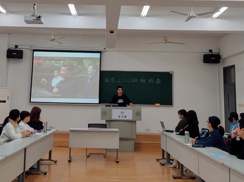 班会伊始,团支书韩正为同学们播放习总书记在岳麓书院考察时的视频。“你们一定要不负时代的重托,继续传承湖湘之地的精神,经世致用,为中华民族伟大复兴贡献你们的所有才智,不负青春、不负韶华,形成成熟的人生观、价值观,系好人生的第一粒扣子,走好人生道路。”总书记的讲话使法学2004班的同学们备受鼓舞、深有感触。