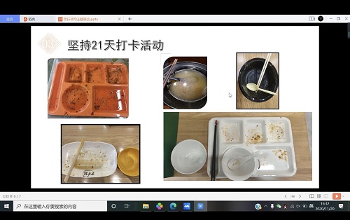 班会进行过半,班长向大家展示了班会之前进行的“21天光盘打卡行动”的成果,同学们在活动中积极分享自己的光盘照片,无不显示出同学们对此次活动的重视程度。班长也借此向同学们呼吁,即使“21天光盘打卡行动”已经结束,但是光盘的好习惯不能因此而放弃。最后,班长对此次班会的内容进行了总结,自古以来,敬天惜粮、勤俭节约就是中华民族的传统美德,厉行节约,反对浪费,不仅仅是一种约束、一种修养的体现,更是一种积极向上精神。同学们听后深有感触,本次班会的目的基本达成,顺利结束。