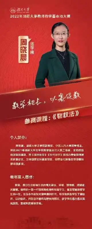 督导随堂听课、教学设计等环节的层层选拔,从全校众多参赛选手中脱颖而出,获得参加文科组决赛的资格。决赛中,周晓晨老师以法学专业核心课程《物权法》参赛,选取建筑物区分所有权中的“住改商”问题进行讲解。周老师通过身边的生活事例引入主题,结合司法案例和法学基本原理,对《民法典》第279条进行了生动有趣的讲解。短短10分钟的现场授课,周老师亲切自如、深入浅出的讲课风格给现场评委和观众留下了深刻印象。最终,周晓晨老师荣获2022年湖南大学教师教学基本功大赛文科组二等奖。
