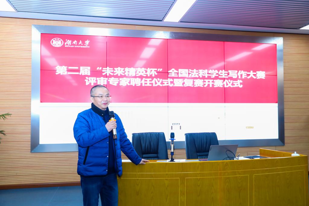 张新宝教授代表组委会致辞。他指出,虽然全国法科学生写作大赛还只是第二届,但取得了良好效果,引起舆论界高度关注,获得中国法学会及张文显教授等诸多专家的赞扬,促进了全国法学教育界的交流,培育了不少优秀人才。他希望比赛继续坚持公平、公正、公开的方式,评选出政治可靠、水平优良、文风端正的好作品。他代表组委会感谢社会各界对大赛的支持,尤其是感谢湖南大学对这项公益事业的无私贡献 ,期待本次比赛积累经验,优化赛制,选拔出更好的学生与作品,做得更好,走得更远。
