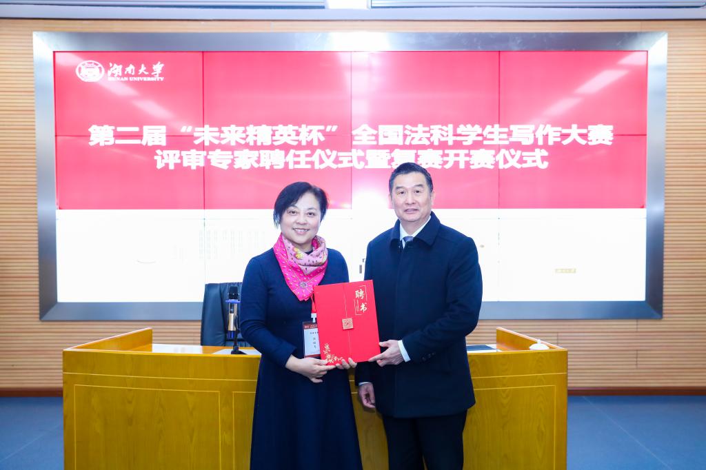 文科学术文摘》常务副主编沈丽飞编审、《法学家》编辑部主任王茜编审、《法商研究》编辑部主任翟中鞠副编审、《法学评论》编辑廖奕教授、《现代法学》青年学术编辑孙莹教授、《环球法律评论》编辑田夫副研究员以及湖南大学张晓勇、熊亚文、周子实、刘怡达、周宇骏、展鹏贺、刘辉等十余位专家作为现场评审嘉宾进行点评。中国人民大学教授、全国法科学生写作大赛组委会主任张新宝教授代表组委会为每位评审专家颁发了专家聘书。
