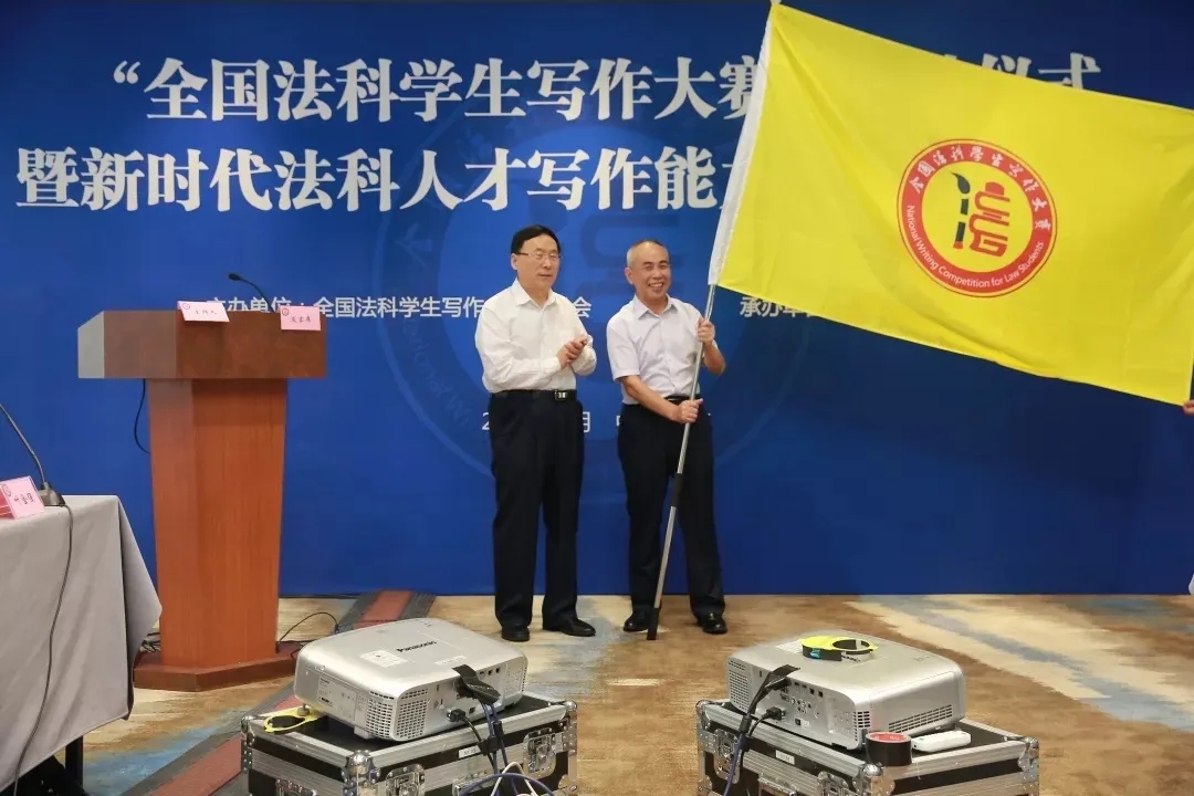 (2019年8月16日,由湖南大学发起的“全国法科学生写作大赛”启动仪式暨“新时代法科学生写作能力培养高峰论坛”在北京友谊宾馆隆重举行,组委会名誉主任张文显教授向组委会秘书长屈茂辉教授授旗)