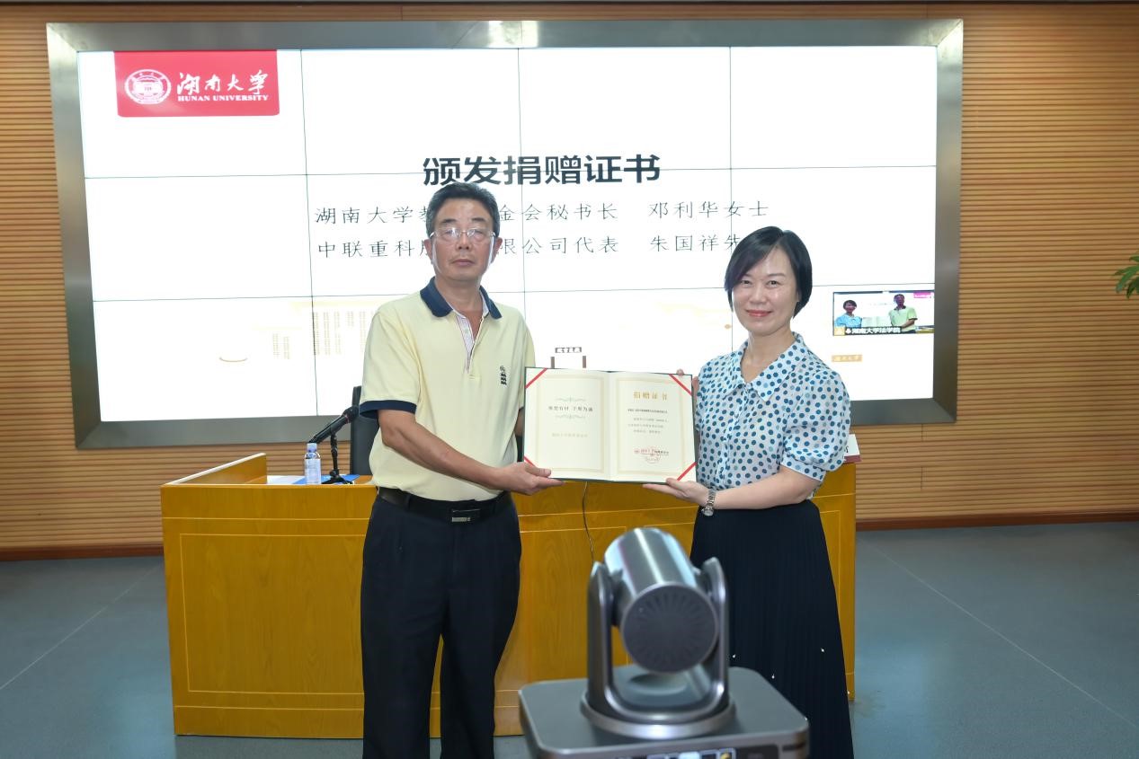 湖南大学教育基金会代表与中联重科股份有限公司代表签署了捐赠协议,湖南大学教育基金会秘书长邓利华为中联重科股份有限公司代表朱国祥先生颁发捐赠证书。
