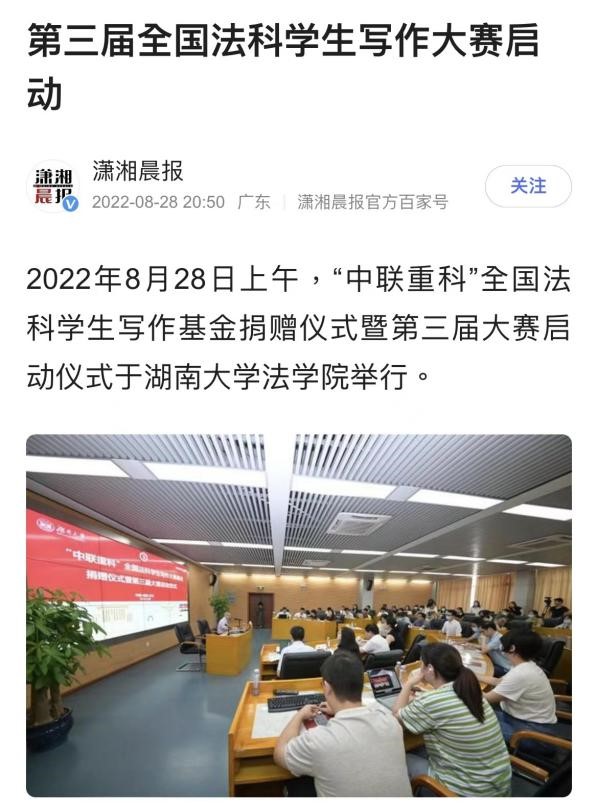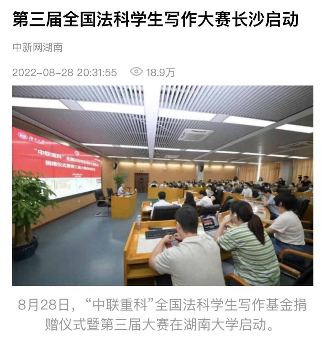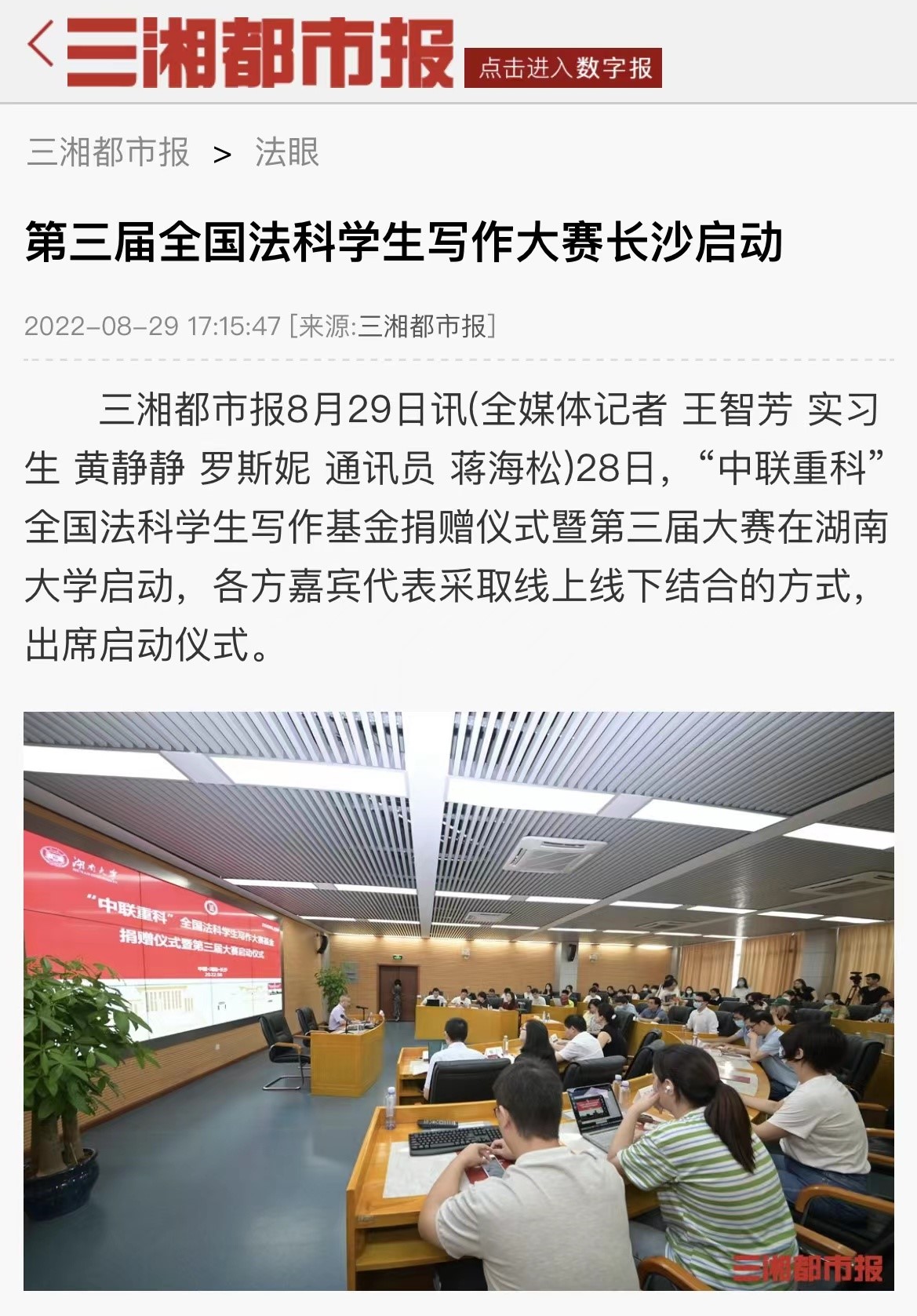 第三届写作大赛的成功启动引发全国媒体密集报道。据不完全统计,已有中国新闻网、《光明日报》、《中国科学报》、《三湘都市报》、《潇湘晨报》、《法治周末》、《湖南法治报》、新浪网、搜狐网、腾讯网、中国科学网、新湖南客户端、红网、华声在线、掌上长沙等全国十多家媒体的报道。活动的详细报道也获得光石法学苑、法学学术前沿、教授加、法科生之家等知名法学公号的转推。