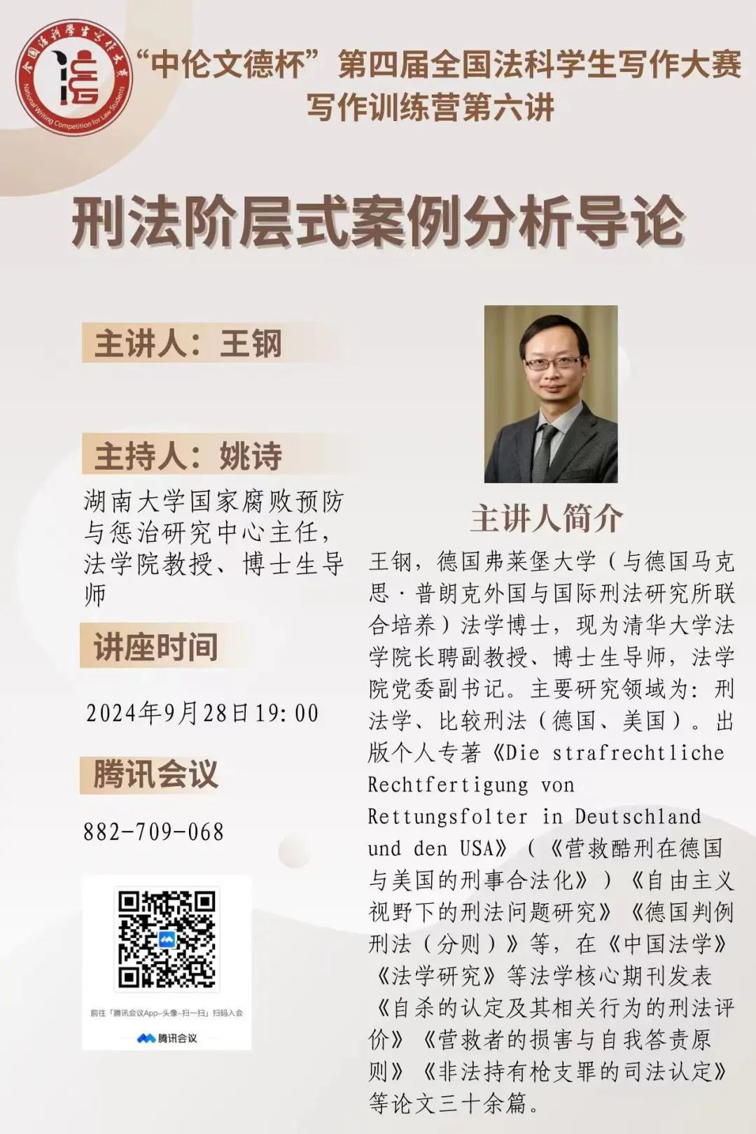 2024年9月28日晚,“中伦文德杯”第四届全国法科学生写作大赛训练营第六讲于线上顺利进行。清华大学法棋牌游戏官网