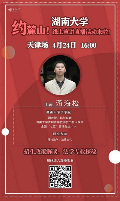2020年4月24日下午,湖南大学线上宣讲直播活动(天津专场暨法学专场)在今日头条APP高考专区等线上平台开播。