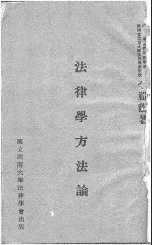 1944年2月,李祖荫先生的《法律学方法论》一书由国立湖南大学法律学会出版。该书亦是李祖荫在湖南大学任教期间出版的一本比较重要的法理学专题作品。在该书中,李祖荫主要讨论了注释研究法、历史研究法、比较研究法、社会学研究法、哲学研究法和结论——综合研究法六种。在“综合研究法”一章中,李祖荫说:“我主张兼采注释、历史、比较、社会、哲学五个方法,治于一炉,来研究法律学,使法律的动态和静态,理论和事实,面面照顾,样样周到,以发挥它的广大精微的效能,这就是‘综合的研究法’与通常所谓综合的研究法即归纳研究法不同。学者往往以演绎法为分析法,以归纳法为综合法,不过是方法论中的一种罢了。”