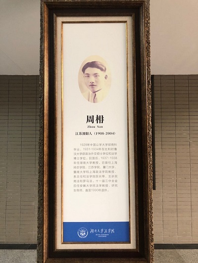 大厅里四根柱子上,分别陈列着李祖荫、李达、黄右昌、周枏四位法学名贤的生平事迹,以示铭记。