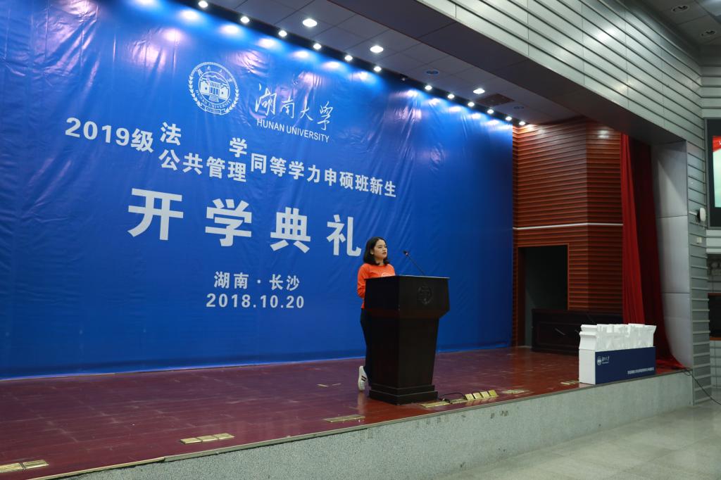 最后,张娜老师作为同等学力申硕班主任代表讲话。她分别从申硕程序、学生服务与平时考核三方面为同学们厘清学习要求与行为规范,提出宽严相济,在工作中帮助配合学生学习,也望其在湘水畔留下美好回忆。
