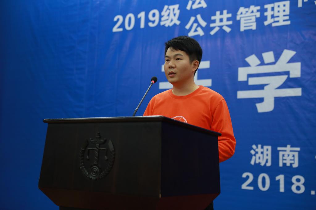 2016级公共管理专业的冀续同学和2019级法学专业的胡昶宇同学分别作为新老生代表进行发言。冀续就自己的学习体验和经验与新生进行交流,同时抒发了作为千年学府湖大学子的骄傲和肩上所背负的家国责任。胡昶宇为新生明志,他认为再次走入校园,格外珍惜的同时要不忘学以致用,他希望通过此次学习,培养批判性思维与钻研精神,从而提高其本职工作的能力。