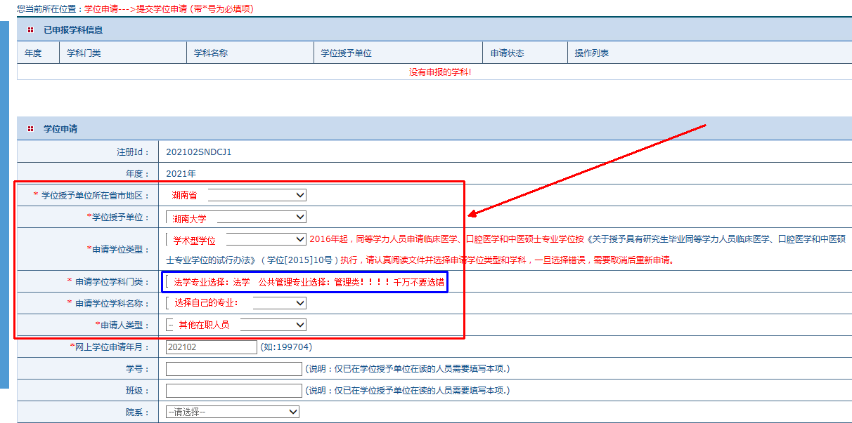 申请学位学科名称:选择自己的专业(法学或公共管理)不要填错