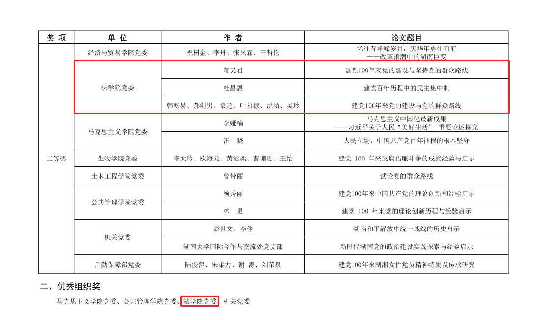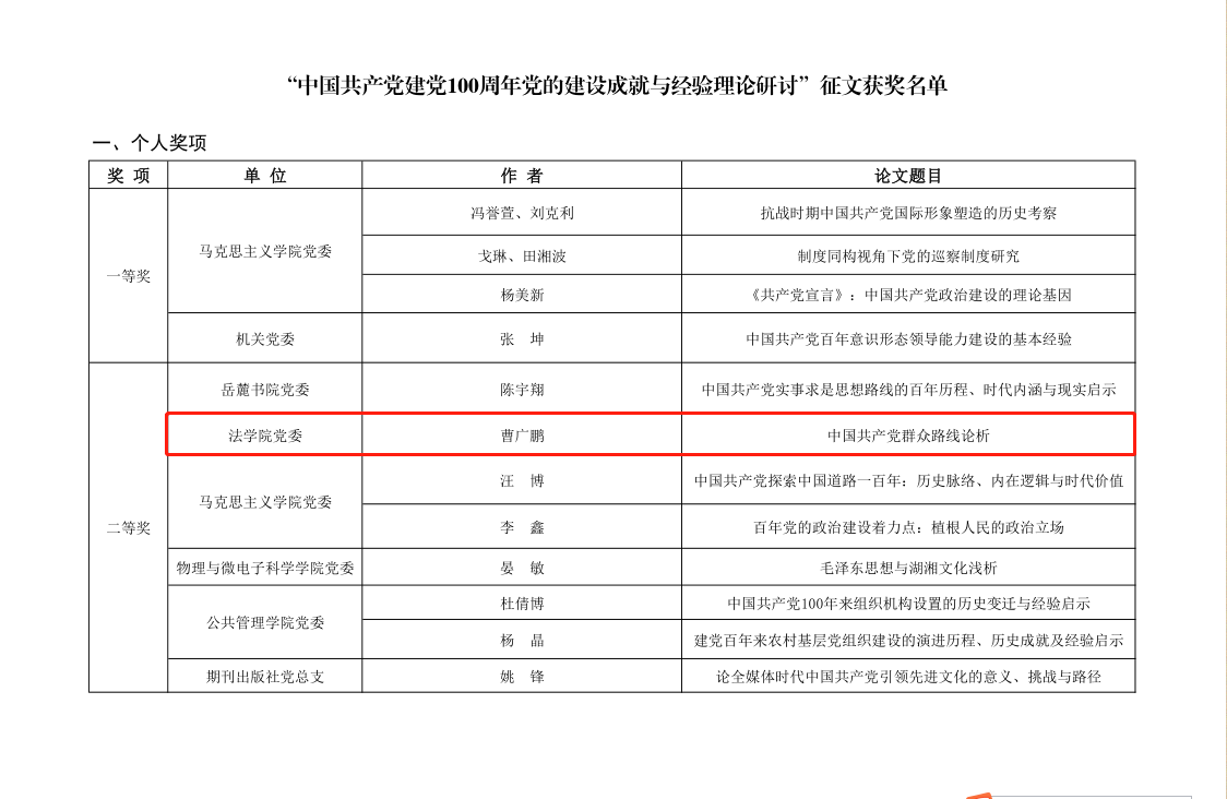 2021年4月23日,由湖南大学党委组织部(党校)主办的庆祝“中国共产党建党 100 周年党的建设成就与经验理论研讨”征文活动公布了获奖作品名单,法棋牌游戏官网 学子表现优秀。