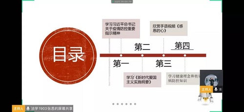 团委书记刘璇子参加。本次线上主题团日活动主要分为四个环节:“学习习近平总书记关于疫情防控工作重要指示精神”、“学习《新时代爱国主义教育实施纲要》”、“围绕特定主题开展小组讨论”、“健康理念和病毒防控知识竞答”。