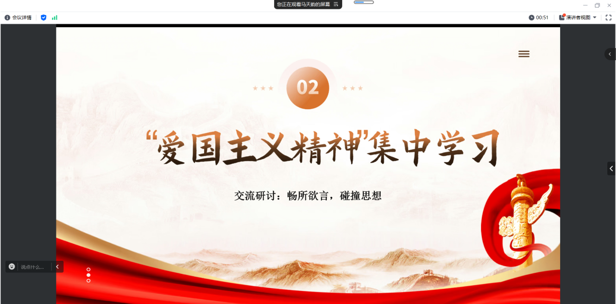 会议最后,党支部书记马天韵总结道,爱国主义是我们每位学生党员应当铭记于心的信念。在新时代的背景下,青年学生要勇于承担历史责任,弘扬伟大爱国主义精神,以实际行动践行对国家和人民的热爱,努力成为国家的栋梁之材,为实现中华民族的伟大复兴而不懈奋斗。